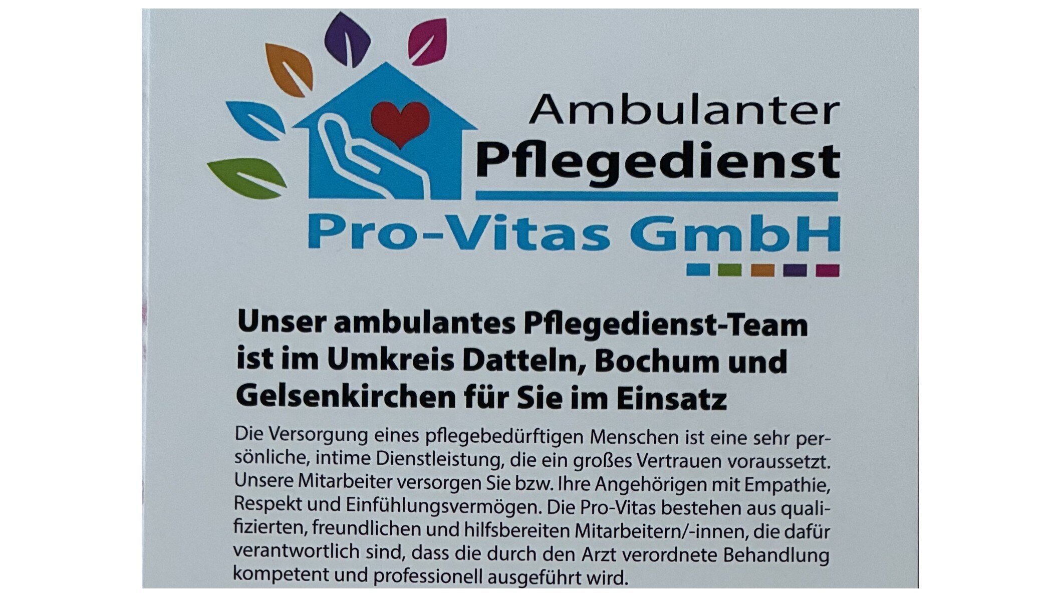 Die Versorgung eines pflegebedürftigen Menschen ist eine sehr persönliche, intime Dienstleistung, die ein großes Vertrauen vorraussetzt. Unsere Mitarbeiter versorgen Sie bzw, Ihre Angehörigen mit Empathie, Respekt und Einfühlungsvermögen. Die Pro-Vitas bestehen aus qualifizierten, freundlichen und hilfsbereiten Mitarbeiter/-innen, die dafür verantwortlich sind, dass die durch den Arzt verordneten Behandlung kompetent und professionell ausgeführt wird.