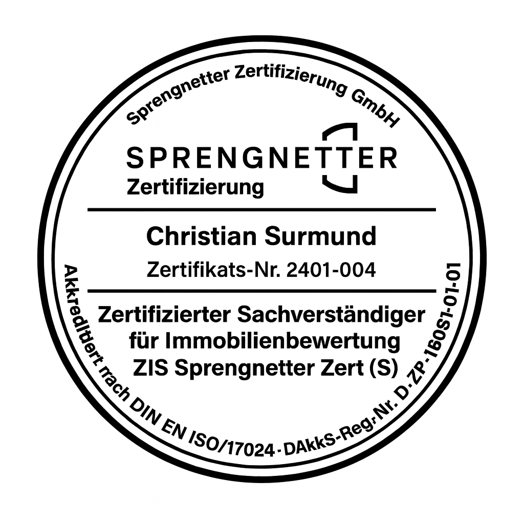 Surmund Immobilienbewertung ist spezialisiert auf rechtssichere Verkehrswertgutachten für steuerliche Zwecke wie Erbschaft, Schenkung, Betriebsvermögensentnahme und Scheidung. Als ISO-zertifizierter Sachverständiger erstellen wir Gutachten nach ImmoWertV, inkl. Standortanalyse, Vergleichswerten und fundierter Dokumentation. Standort Köln mit Besprechungsmöglichkeit im Regus Business Center – ausschließlich nach Vereinbarung. Persönliche und unabhängige Beratung – diskret, nachvollziehbar und finanzamtgeeignet.