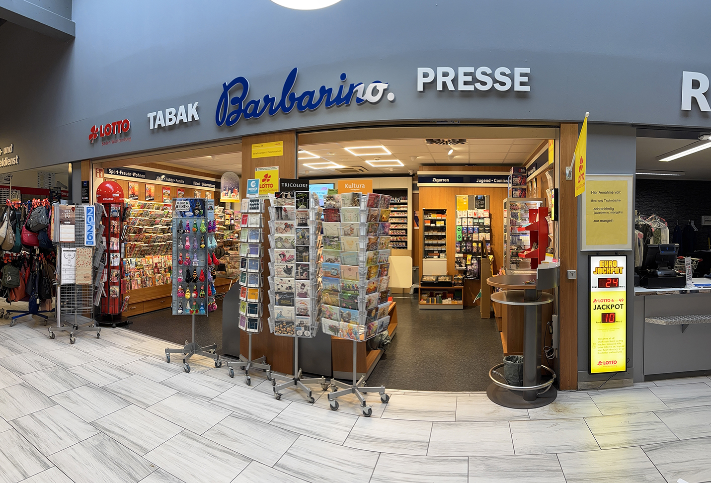 Rauchkultur seit 1887: Zigarren, Pfeifen, Zigaretten, Raucherbedarf und mehr. Hoher Anspruch, beste Qualität, kundige Beratung. Oft ergänzt durch Dienstleistungen wie Lotto/Toto sowie eine große Presseauswahl. Unsere Zielgruppe sind qualitäts- und verantwortungsbewusste Genussraucher sowie Reisende. Fachgeschäfte der Marke Barbarino verfügen in der Regel über einen Humidor.