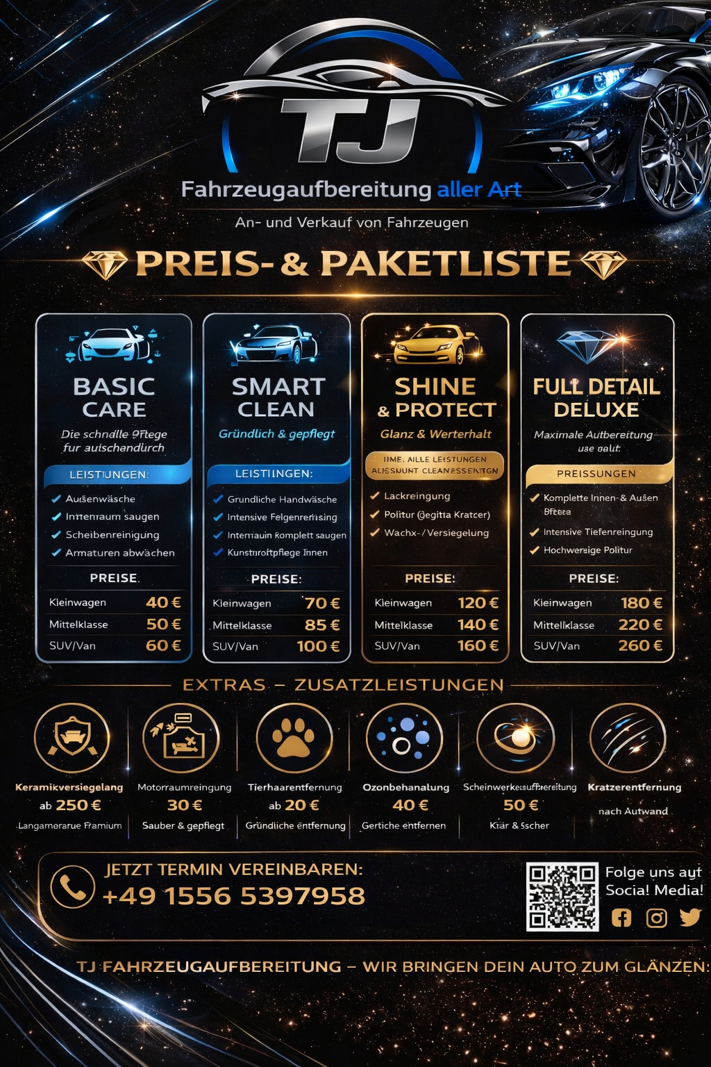 TJ Fahrzeugpflege ist Ihr Spezialist für hochwertige Autoaufbereitung und Autopflege. Wir bieten ein umfassendes Leistungsspektrum von der professionellen Lackpolitur und Lackaufbereitung bis hin zur gründlichen Innenraumreinigung. Vertrauen Sie auf unsere Expertise für eine langanhaltende Keramikversiegelung, die den Wert Ihres Fahrzeugs schützt und erhält. Ob Autowäsche oder komplette Fahrzeugaufbereitung, wir sorgen für ein perfektes Ergebnis und strahlenden Glanz.