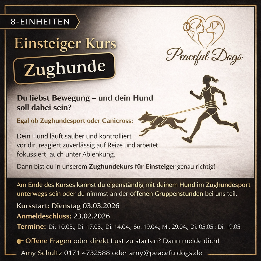 Peaceful Dogs – Mobile Hundeschule & Hundetraining in Unterfranken peaceful Dogs ist deine mobile Hundeschule für individuelles Hundetraining in Bad Kissingen, Rhön-Grabfeld, Schweinfurt und Würzburg. Ich unterstütze dich dabei, ein harmonisches Zusammenleben zwischen Mensch und Hund aufzubauen – alltagsnah, fair und individuell. Als mobile Hundetrainerin komme ich direkt zu dir oder trainiere dort, wo Herausforderungen im Alltag entstehen. Ohne Verträge, ohne Laufzeiten. Meine Leistungen: Einzeltraining, Gruppentraining, Kennenlerngespräch, Alltagstraining, Workshops, Hilfe bei Verhaltensproblemen und Wandertage mit Hund. NEU: Hundesport, Zughundesport & Canicross für aktive Mensch-Hund-Teams – für Einsteiger & Fortgeschrittene.