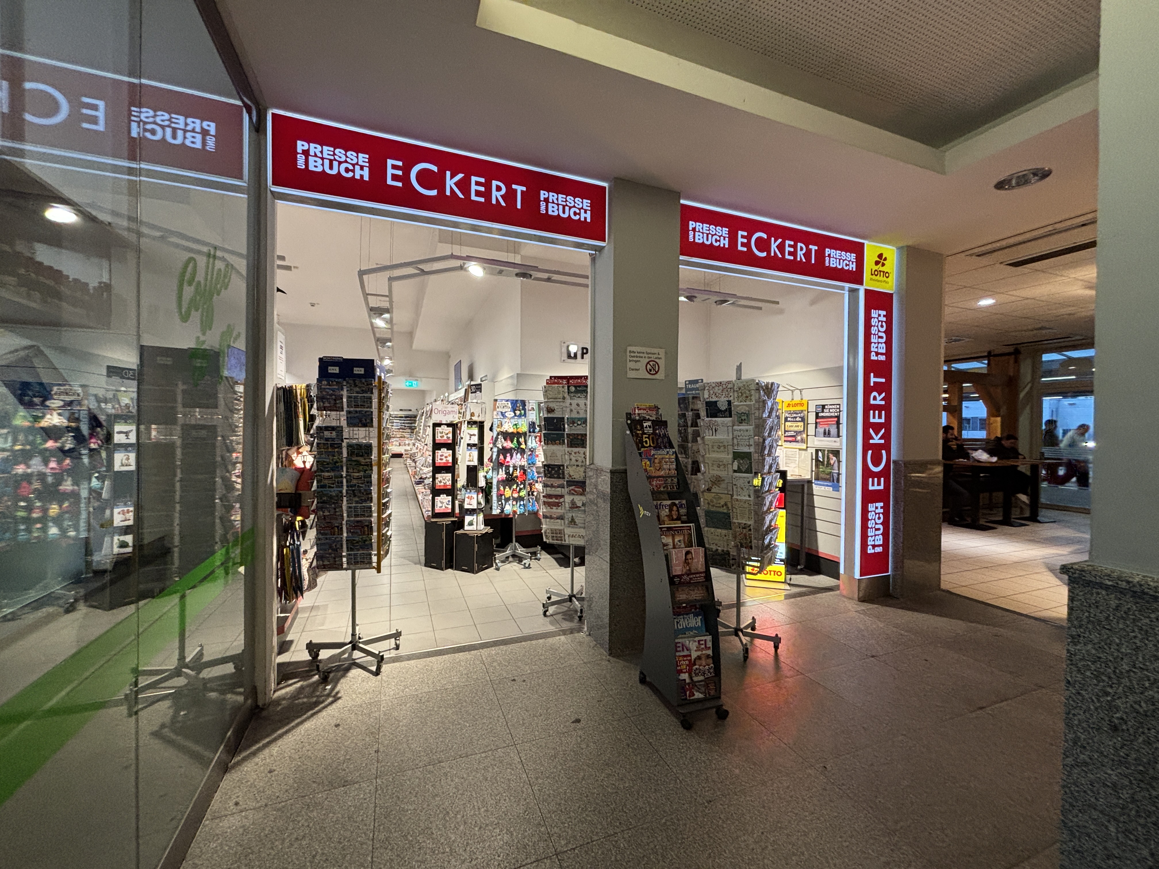 ECKERT ist das Pressefachgeschäft für Zeitungen und Zeitschriften, Bücher, Tabakwaren, Reisebedarf, Lotto/Toto. Oft mit Convenience-Produkten, Snacks, Kaffeespezialitäten und kalten Getränken. Presse und Convenience für Reisende, Pendler und das lokale Umfeld, fast überall mit der größten Presseauswahl am Ort. Außergewöhnliche Öffnungszeiten, auch an Sonn- und Feiertagen.