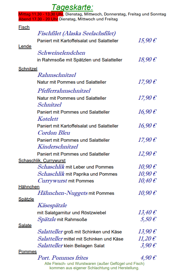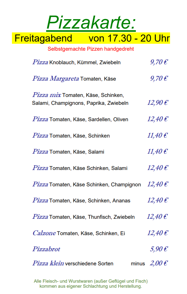 - Tags: Biergarten, Braten, Brotzeit, Burger, Eigene Schlachtung, Fremdenzimmer, Gaststätte, Metzger Cup, Pizza, Schlachtschüssel, Schnitzel, Spielplatz